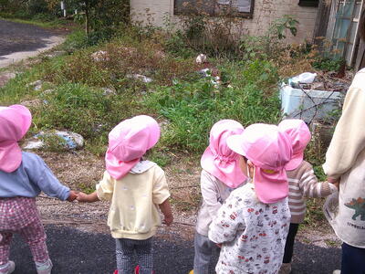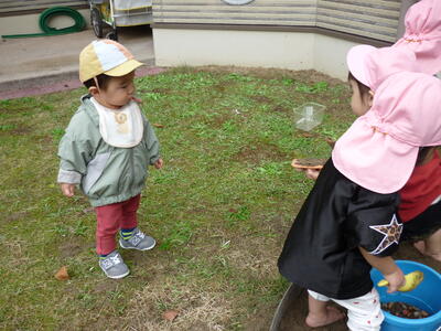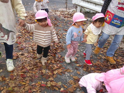 柿、柿の木、柿の葉っぱ等を近くで見て、しっかりと印象に残ったようで、散歩の帰り道は「柿がある!」「あっちにもある」と、柿見つけ名人になっていたこあら組さんです。