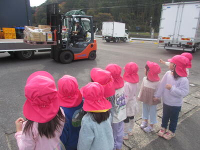 お散歩に出かけると、ちょうどフォークリフトがお仕事をしていました。