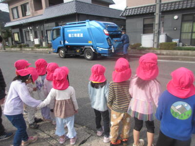 そして後ろを振り返ると、ちょうどゴミ収集車が!